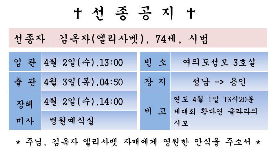 故 김옥자 엘리사벳 페이지 정보 작성자 admin 댓글 0건 조회 1,100회 작성일 25-04-01 13:13 본문 1 목록 이전글故 홍남표 베드로 25.04.09 다음글故 정동희 요셉 25.03.27