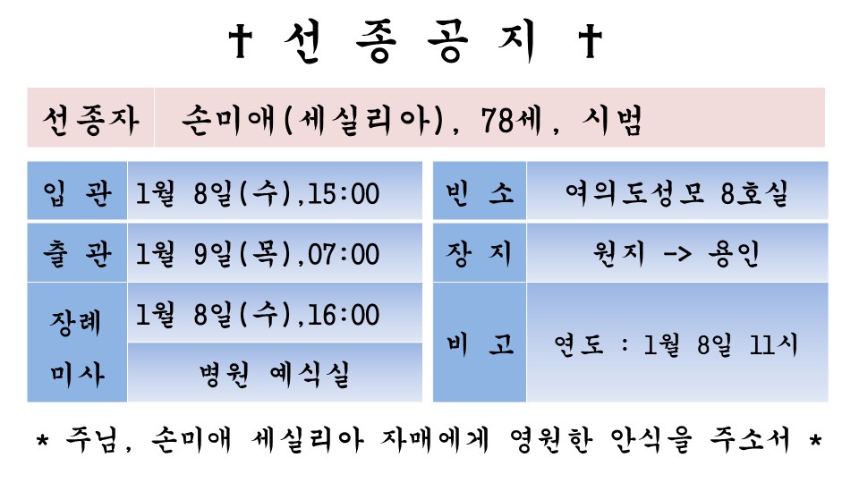 故 손미애 세실리아 페이지 정보 작성자 admin 댓글 0건 조회 1,301회 작성일 25-01-07 14:46 본문 1 목록 이전글故 이보승 요셉 25.01.10 다음글故 김명호 스테파노 24.12.13