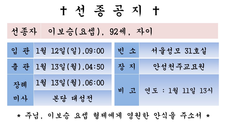 故 이보승 요셉 페이지 정보 작성자 admin 댓글 0건 조회 1,320회 작성일 25-01-10 17:27 본문 1 목록 이전글故 이호염 헬레나 25.02.09 다음글故 손미애 세실리아 25.01.07