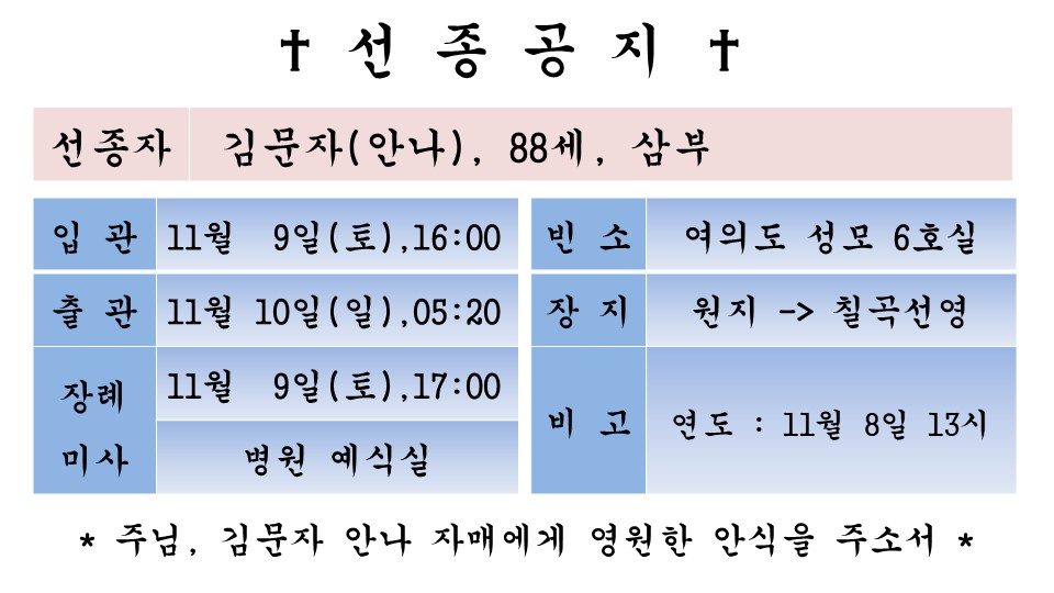 故 김문자 안나 페이지 정보 작성자 admin 댓글 0건 조회 1,636회 작성일 24-11-08 15:00 본문 목록 이전글故 홍정미 수산나 24.11.12 다음글故 김소순이 헬레나 24.09.29