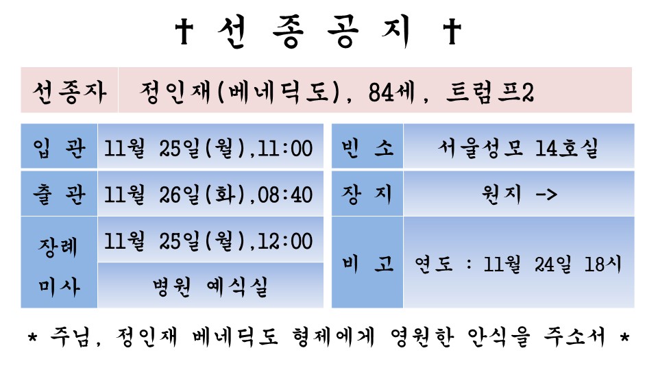 故 정인재 베네딕도 페이지 정보 작성자 admin 댓글 0건 조회 1,590회 작성일 24-11-24 15:32 본문 목록 이전글故 김명호 스테파노 24.12.13 다음글故 홍정미 수산나 24.11.12