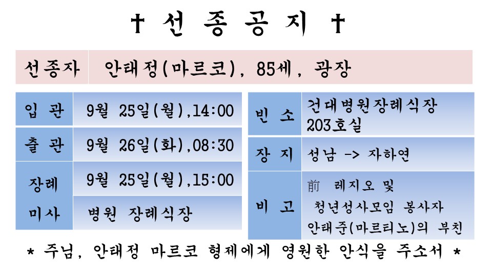 故 안태정 마르코 페이지 정보 작성자 admin 댓글 0건 조회 2,760회 작성일 23-09-24 18:24 본문 1 목록 이전글故 한원동 토마스 23.11.01 다음글故 조호조 미카엘 23.09.21