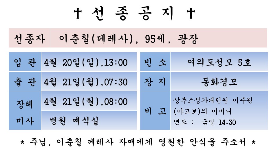 故 이춘칠 데레사 페이지 정보 작성자 admin 댓글 0건 조회 1,022회 작성일 25-04-19 12:55 본문 1 목록 이전글故 김영숙 안나 25.04.23 다음글故 홍남표 베드로 25.04.09