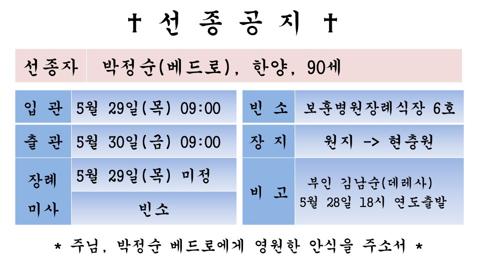故 박정순 베드로 페이지 정보 작성자 admin 댓글 0건 조회 889회 작성일 25-05-28 15:37 본문 1 목록 이전글故 유하민 요셉 25.05.30 다음글故 윤영여 율리아 25.05.14