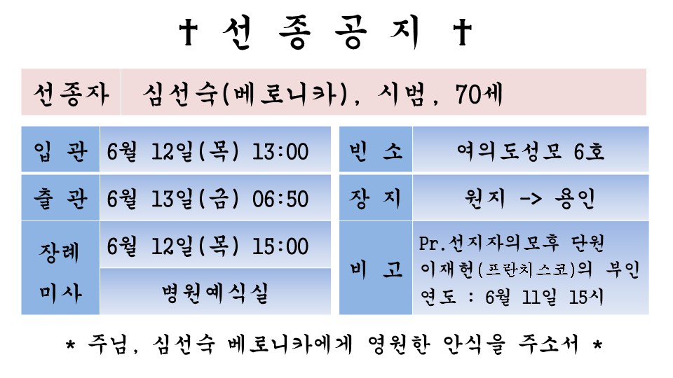 故 심선숙 베로니카 페이지 정보 작성자 admin 댓글 0건 조회 834회 작성일 25-06-11 10:08 본문 1 목록 이전글故 고웅진 마리아 25.06.14 다음글故 김수길 루까 25.06.10
