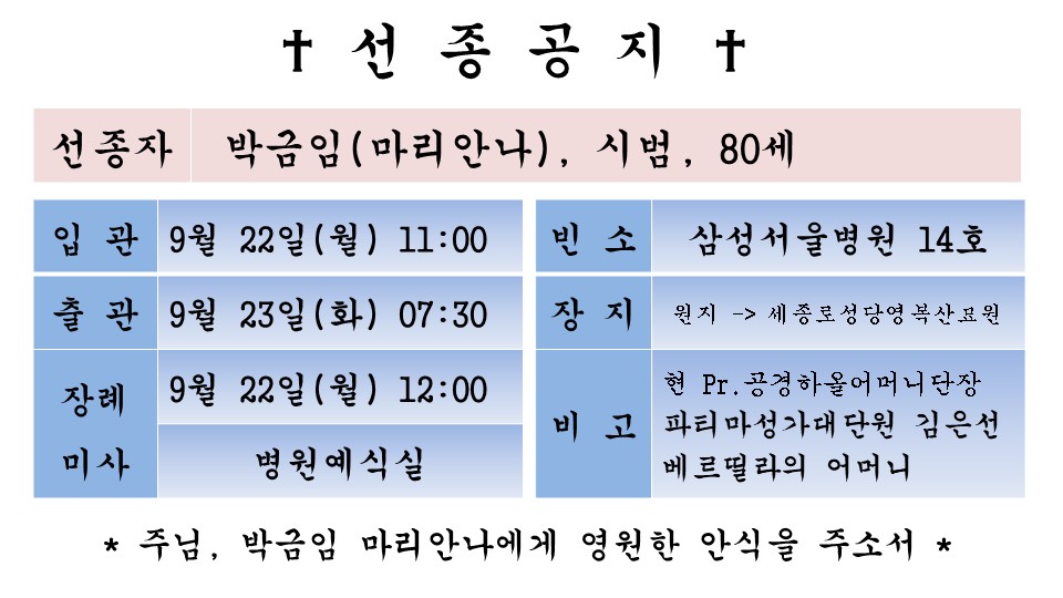 故 박금임 마리안나 페이지 정보 작성자 admin 댓글 0건 조회 421회 작성일 25-09-21 16:19 본문 1 목록 이전글故 서규철 레오 25.09.25 다음글故 이중복 바울라 25.09.03