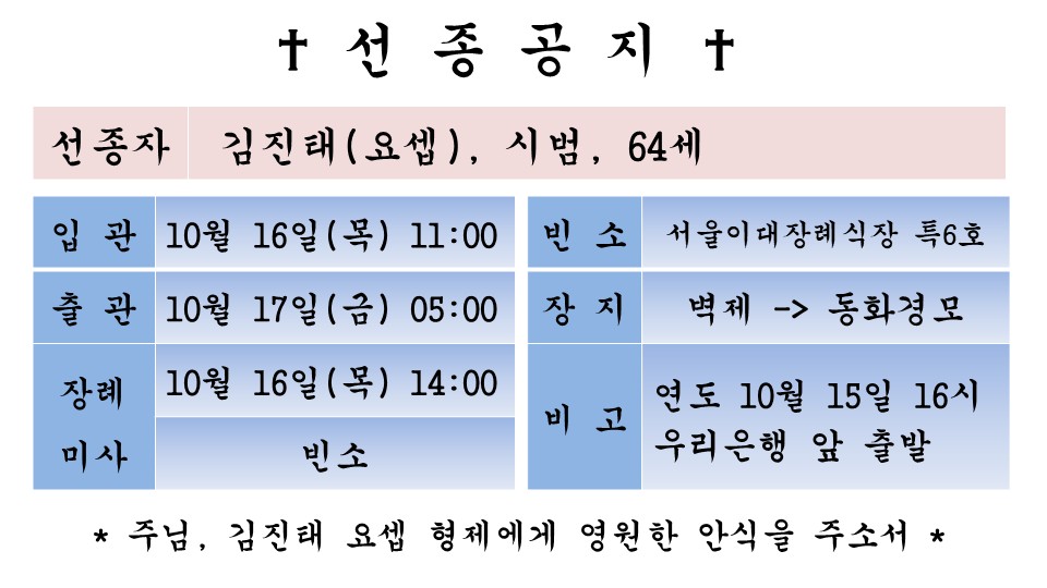故 김진태 요셉 페이지 정보 작성자 admin 댓글 0건 조회 278회 작성일 25-10-15 15:23 본문 1 목록 이전글故 이은실 벨라뎃다 25.10.29 다음글故 서규철 레오 25.09.25